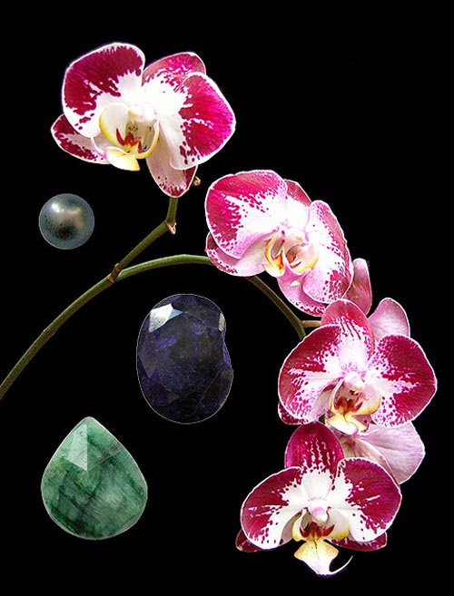Mit Schwingungsinformationen von Doritaenopsis Juihbao Fairy, Smaragd-Edelstein, Saphir-Edelstein & Schwarze Perle-Edelstein