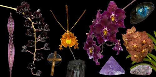 hybrid, Bulbophyllum purpureorachis, Oncidium hybrid, Amethyst-Edelstein, Schwarzer Turmalin-Edelstein, 24kt Gold, Obisidan-Edelstein, Rubin-Edelstein & Spectrolite-Edelstein