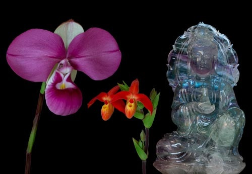 Mit Schwingungsinformationen von Phragmipedium besseae variety d’allesandroi, Phragmipedium kovachii & Kuan Yin Fluorit-Edelstein